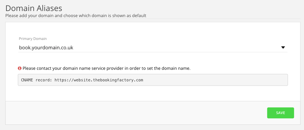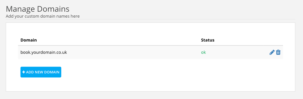 Status should say OK if not please look at the CNAME record and double check if it was correct. If you had to adjust the CNAME record you will need to delete the domain by clicking on the trash bin and add the domain, book.yourdomain.co.uk again.