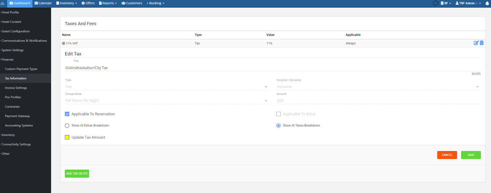 Passaðu svo að gistináttagjaldið sé innifalið í öllum verðplönum sem þú býður uppá. Ferð í Settings - Inventory - Rate plans. Opnar verðplan og bætir við gistináttagjaldi á verðplönin undir attached tax( þetta ætti að vera sett upp nú þegar en gott er að vera alveg viss). Við mælum svo með að gera "test" bókun og receipta hana til þess að sjá hvort að þetta sé ekki að koma rétt út bæði í Booking Factory kerfinu og í bókhaldskerfinu hjá þér ef þú ert beintengdur við slíkt kerfi.