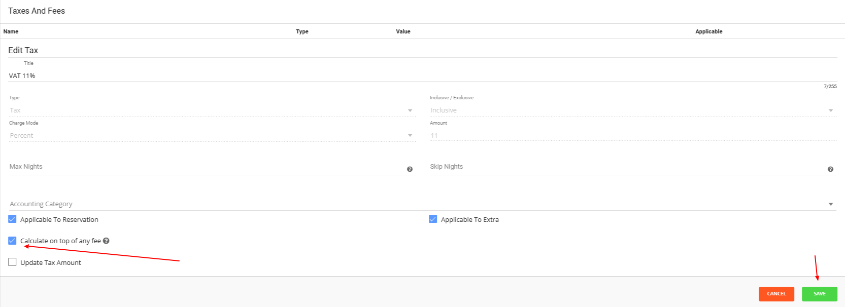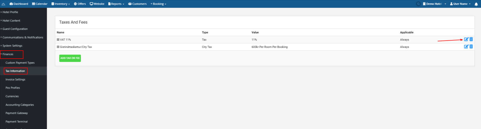 Edit your your VAT tax in Booking Factory by clicking on the pencil icon on the right hand side.