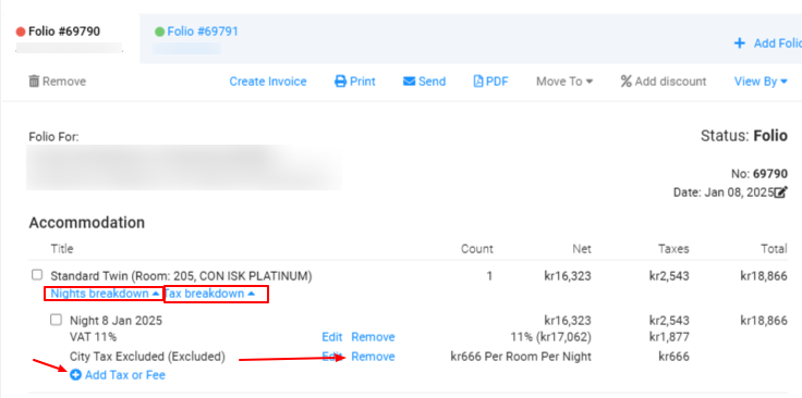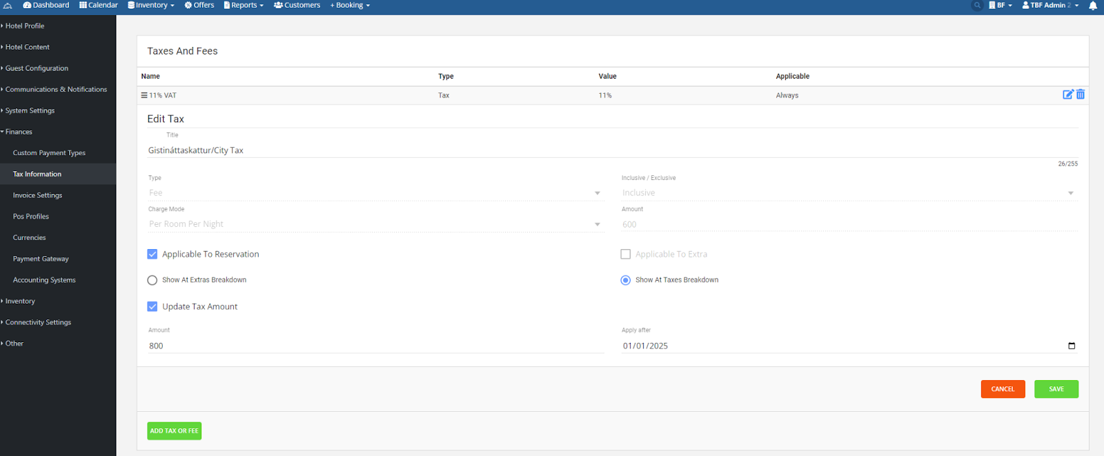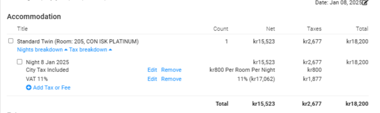 Access your city tax fee that is already created in the system and update the tax amount to be 800kr (per room per night), by ticking the option ‘Update tax amount’. The updated city tax should apply after 01/01/2025.