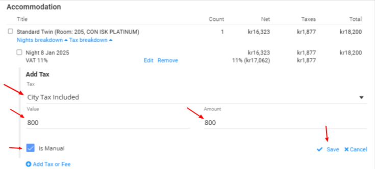 5. Select the city tax from the drop down list, tick "Is Manual" box and type in 800 in Value and Amount. Click Save