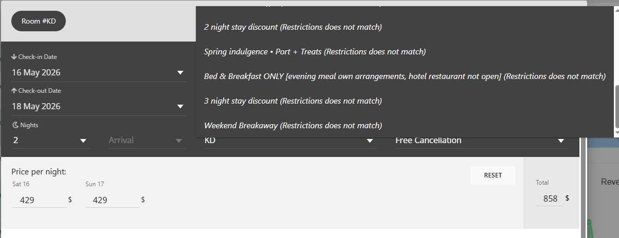 If a rate does not pass any of these criteria, it will still be visible in the dropdown but will be marked with "(restrictions do not match)" to indicate its unavailability under the current conditions.